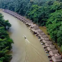 A floating raft hotel in the rainforest of Kanchanaburi, a dream floating on the River Kwai
