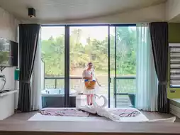 And here is called Today, Nicky stayed in a riverside room☘️ The room is very good, new, big and clean. ⭐️ There is a bubble bathtub, very nice view, especially in the morning. The weather is good and not hot. Plus, here there are many styles of rooms to choose from.