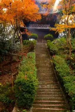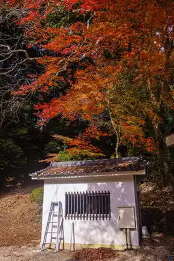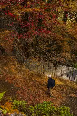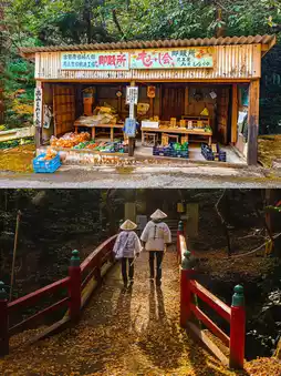 The original plan to see the red leaves in the deep mountain valley of Oda has already fallen, so we decided to go to Xishan Xinglong Temple temporarily. Climbing up the steps, we saw two climbers wearing straw hats and robes, we followed their footsteps, as if we could discover the secrets of Xinglong Temple with them. The mountain is not high or low, the weather is not cold or hot, and hiking is very comfortable. We came a few days late, a few days ago the maple leaves were red half the sky, today the fallen leaves are all over the river. This is a very niche maple viewing place, no tourists, only a few locals, like climbing a small mountain near their own home, walking around casually, feeling happy and relaxed. We also saw a unmanned shop on the way (Figure 9), a large bag of persimmons for 500 yen (about 25 yuan), grown by local farmers, fresh and delicious, you can feel the simple and kind folk customs.