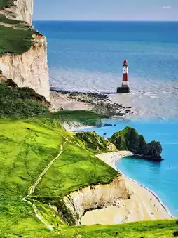 Continue to Beachy Head (UK’s tallest sea cliff at 162m)—red lighthouse contrasts starkly with white cliffs!