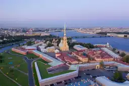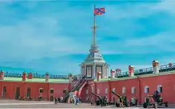 The Peter and Paul Fortress is located on Hare Island in the center of St. Petersburg and is the city's birthplace. Built in 1703 by order of Peter the Great, it was initially constructed to defend against Swedish forces and later became a political prison of Tsarist Russia, where famous figures like Dostoevsky were once imprisoned. The Peter and Paul Cathedral within the fortress is renowned for its golden spire, the tallest bell tower in Russia, and serves as the burial site of Russian tsars, bearing witness to the rise and fall of St. Petersburg.
