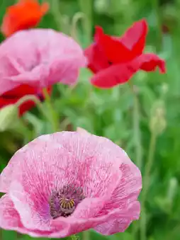 Tulips, poppies, salvia, cosmos, and other seasonal flowers are in bloom.