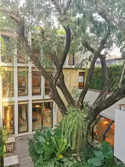 The open atrium and large windows offer sofa and terrace seating. The interior is luxurious