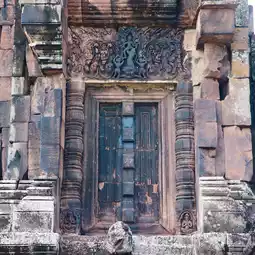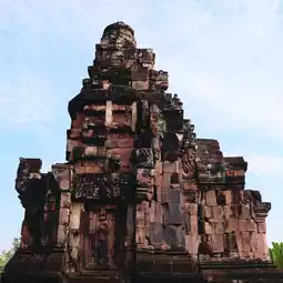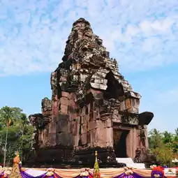 🙏It is an ancient site from the Khmer and Bapuan periods, built of sandstone on a laterite base. It stands out with a single prang, called “Narai Kha Yao” because the doors and arches are tall and long in the style of Khmer art from the 16th–17th Buddhist centuries. There are stone carvings of Vaishnava fairy tales, such as Narayana reclining on the ocean and Krishna subduing the lion, on the lintel and window arches.