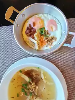 The local breakfast, such as pan-fried eggs and local soup, is served hot with a smile.