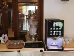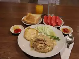 Breakfast is served, including rice porridge, coffee, and delicious local dishes. 🍲☕
