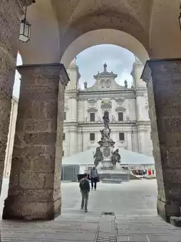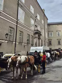 The square in front of Salzburg Cathedral is filled with the romantic atmosphere of medieval times, as classic carriages ply the streets. The sound of horses' hooves and the majestic cathedral scenery combine to create a special moment. 🐴✨🌿
