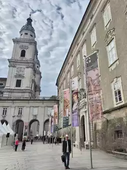 Stepping inside, you're greeted by magnificent ceiling paintings and a pipe organ, embodying the city's culture and history. From the facade to the interior, the iconic beauty of Salzburg abounds. 🎶💫📸