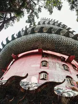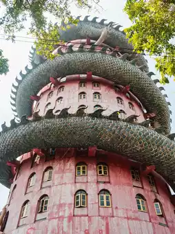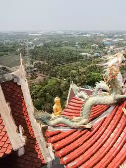Wat Samphran or Dragon Temple 🐉 (Wat Samphran) One of the distinctive features of this place is the green dragon that wraps around the building from the bottom to the top. We can go up to see the top of the building by walking. It feels like being in a cave. It's a little steep and stuffy.