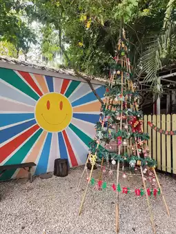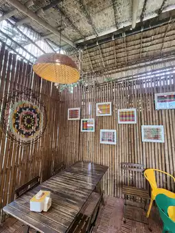 Cafe and restaurant in the garden, shady, lots of trees, many seating areas to choose from, many foreigners, people coming and going all the time, there is a small playground, suitable for coming with family, friends