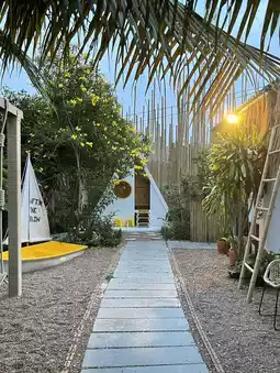 ร้านตั้งอยู่ใจกลางสวนมะนาว มะพร้าว และต้นหมาก บรรยากาศร่มรื่น ตกแต่งแบบมินิมอลโทนสีขาว สบายๆ เหมือนบ้านเพื่อน