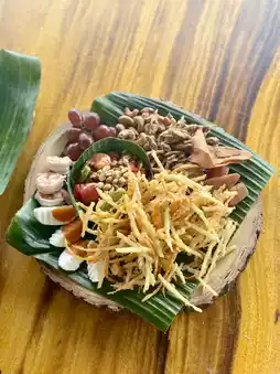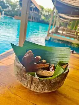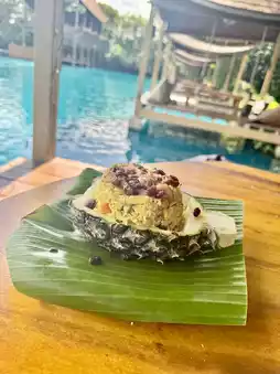 Pineapple fried rice, BBQ chicken wings, and fried papaya salad