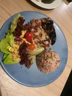 This place is famous for its amazing salad bar 🥗✨ that you can refill as much as you want, with fresh vegetables, a variety of salad dressings, and side dishes such as soup, bread, pasta, or fruit 🍞🍝🍇 The salad alone is worth more than the price!