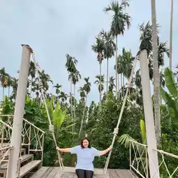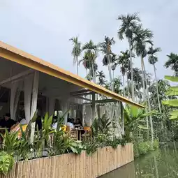 A "Glass House" cafe nestled amidst a coconut, lemon, and areca nut grove, offers a lush atmosphere perfect for relaxing, sipping coffee, and snapping photos for social media. There are a variety of seating options: air-conditioned rooms, a breezy terrace, or even a bamboo raft floating on a raised canal.