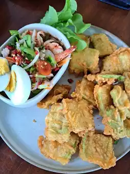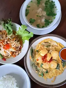 Single-dish meals and side dishes like the delicious basil omelet or the crispy eggplant salad are also excellent.