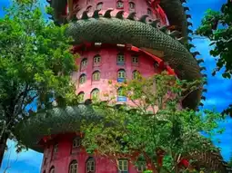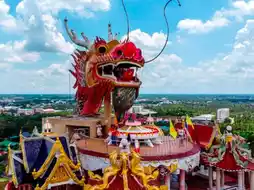 Wat Samphran, Nakhon Pathom Province, is a unique Thai temple featuring a large pink cylindrical building wrapped by a giant dragon, which serves as its main highlight. Visitors can walk up through the dragon's tunnel to enjoy a 360-degree panoramic view from the top of the building. Additionally, the temple houses various sacred objects and sculptures for worship and admiration, such as the large golden Buddha statue, Luang Por Phuttho Phawana, the white elephant sculpture, the Naga treasure pot, and many more. It is an ideal place for photography, making merit, and relaxation.
