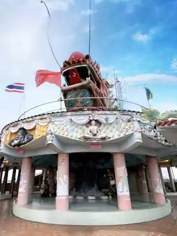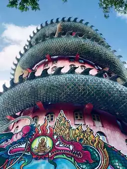 #GetDiscountsWithoutLuck Wat Samphran in Nakhon Pathom Province is a unique temple, boasting a tall pink building adorned with a gigantic dragon, a truly awe-inspiring sight. Inside, you can climb up to the top, admiring the beautifully decorated and tranquil atmosphere. Upon reaching the top, you'll be rewarded with sweeping views of the Tha Chin River and the surrounding temple grounds. It's a popular photo spot, and everyone who visits here must stop to take a photo with the giant dragon. It's both magnificent and charming, unlike anywhere else.