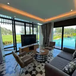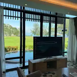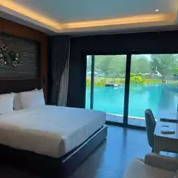 The room is a pool villa, probably the biggest in the hotel (3 bedrooms, 3 bathrooms, living room and kitchen area), sea view, and you can open the bedroom door, living room door, and go straight into the pool