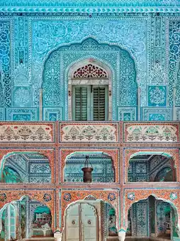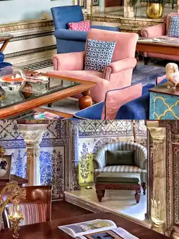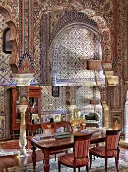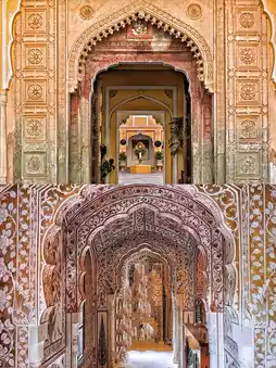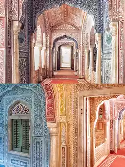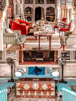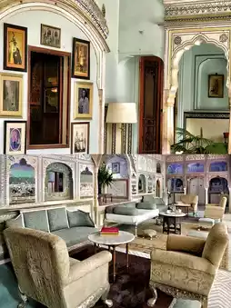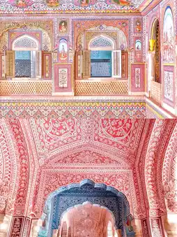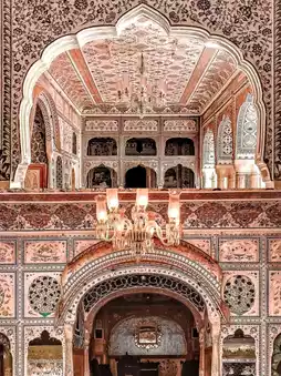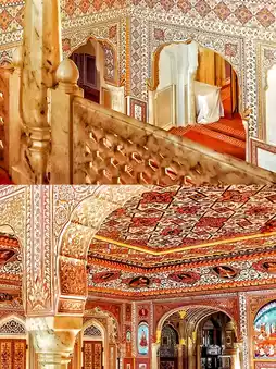 Samode Palace is a beautiful and elegant palace with a yellow theme, featuring sturdy and traditional Indian architecture.