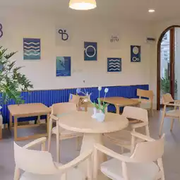 The interior of the shop is decorated in a homey style, focusing on white, blue and wooden furniture as the main tones. It looks simple and comfortable to the eyes. Plus, the space is divided into proportions. It is divided into 3 main zones.