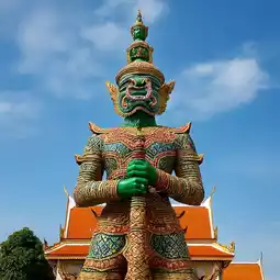 🙏 Start by paying respects to the large and majestic Thao Wessuwan, standing prominently in front of the temple, bringing good fortune and warding off evil.