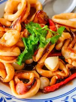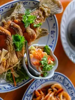 The signature dish is the stir-fried squid with shrimp paste. The squid is incredibly fresh and delicious. The fried sea bass with fish sauce is also excellent. The crispy fish is delicious. The creamy tom yum goong has incredibly fresh shrimp. It's perfect with fried rice. Enjoy the riverside view, and you can even see the Big Buddha statue across the river. It's truly amazing! If you're passing by, don't forget to stop by and give it a try.