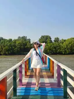 Discover colorful photo spots like the Kahlong Seaside Viewpoint, which features a walkway extending into the sea painted in vibrant colors. At the end of the walkway, you'll find picturesque photo opportunities. Nearby, just 300 meters away, there's the Rainbow Wooden Bridge, equally stunning with its colorful and dynamic design. The atmosphere is fantastic, with refreshing sea breezes. On the way to the Rainbow Bridge, you'll pass a concrete bridge surrounded by lush mangrove forests, offering a serene and shaded environment.