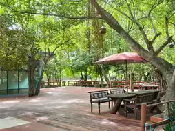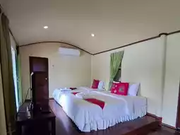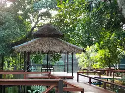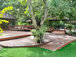 The resort also features a wooden deck extending over the water, where you can enjoy your morning coffee or have dinner while watching the sunset—an experience that's truly delightful. For those who wish to explore nearby attractions, there are places like the "Phanthai Norasing Shrine," "Mahachai Canal Market," or "Bang Krachao of Samut Sakhon" to visit during the day.