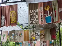 Walk around and you'll find indigo-dyed clothing, handmade accessories, postcards, painted cloth bags, and a beverage cafe—each booth has a story to tell.