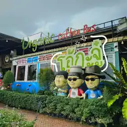 A shop in San Sai, Chiang Mai, surrounded by nature, "Grindsize Evergreen CNX" is surrounded by rice fields, and the trees around are very shady. 💚