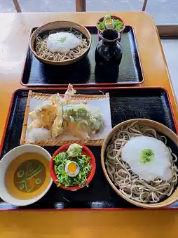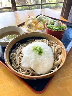☝ During a visit over a holiday, there were 18 groups ahead, and the wait was about 30 minutes. Ordered the Unsu Soba (a mix of grated radish and yam, priced at 1,050 yen) and tempura. There are pet-friendly seats outside, but they can be used even if you don’t have a pet. There’s also a dojo where you can experience making soba noodles.