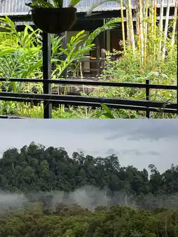 On the last day, you can go to Gomantong Cave, which has cockroaches and bats. After exiting the cave, you can climb the stairs to overlook the Sukau rainforest. The lodge has two small swimming pools, a bar, and a rainforest trail at the back. It takes about 20 minutes to walk the whole way, and there may be wild animals.