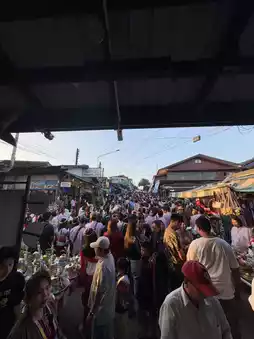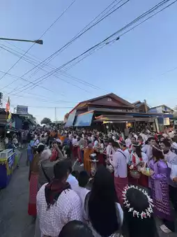 Early in the morning at six in the morning, leave your accommodation to make merit and offer alms. You can offer alms on both the Thai and Mon sides. On the Thai side, it will be from 6:00 to 7:00. On the Mon side, it will be a bit later in the morning, and you can walk across the bridge. Most of the alms offerings are sold as sets, and there are also cute Mon costumes to borrow. I highly recommend that anyone who visits here must not miss it.