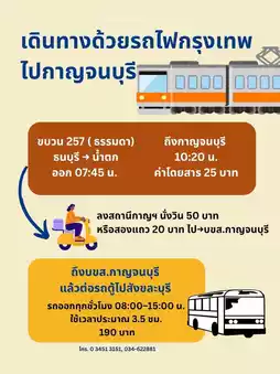 👉 Get off at Kanchanaburi Station, take a motorcycle taxi or songthaew to Kanchanaburi Bus Terminal, then a van to Sangkhlaburi.