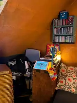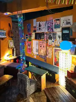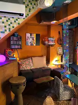 The interior is small and cozy, reminiscent of an attic. Vintage props and posters are scattered throughout, making it fun to browse.