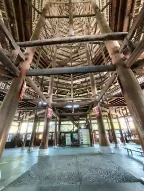 The Sanjiang Drum Tower was built in 2002 to commemorate the 50th anniversary of Sanjiang Dong Autonomous County. Four giant cedar trees support the tower, and its architectural style, built without nails but using logs, can be seen from inside the building.