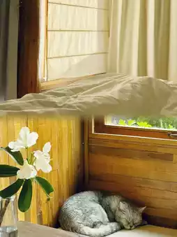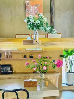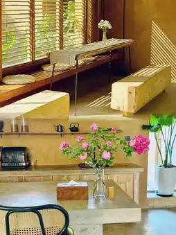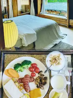 It's really beautiful!! Every place is carefully designed, including every flower that is matched perfectly. The overall design is a rustic wooden style, with rough earth-colored walls, matched with a lot of wooden frames and glass. The sun shines in anytime and anywhere, forming various light and shadows, and it looks good no matter what you take!! There are 10 rooms in the B&B. We stayed in a family suite (the B&B has two rooms), which can add a child's bed. The housekeeper said that this is the room where Liu Yifei's sister stayed during the filming. The lighting in the room is also very good! There is a glass viewing bay window, from which you can see the central courtyard of the homestay, with green plants, flowing water, and kittens. It is truly a paradise. There is also a small balcony with a chair where you can sit and read, which is very enjoyable.