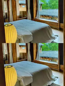 🏨 The B&B has 10 rooms. We stayed in the family suite (one of two in the B&B), which can accommodate an extra bed for a child. The host told us this was the room Liu Yifei stayed in during filming. The room is incredibly bright!! It features a glass bay window overlooking the central courtyard, with lush greenery, flowing water, and a little cat—truly a hidden paradise. There’s also a small balcony with a chair, perfect for sitting and reading.