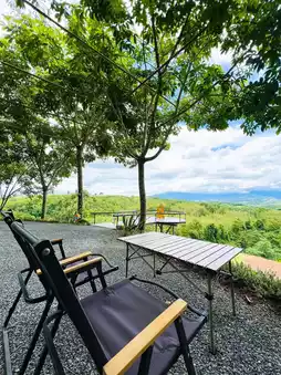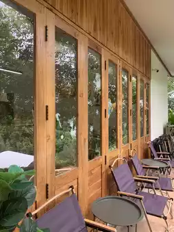 A cafe with a view of Doi Phukha, good atmosphere, mountain view, 2 seating areas, inside and outside. We recommend the outside, beautiful view, sit and relax, look at the mountains, all green, comfortable to the eyes. If you go during the rainy season, it will be a bit lush. The road to get there is good, a bit curvy, but the view is very beautiful.