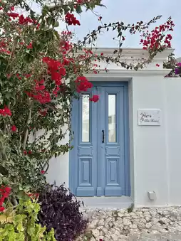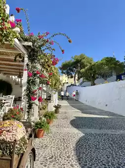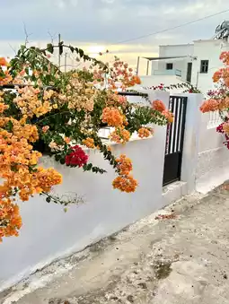 April is the perfect time to visit Santorini! The weather is just right—warm and sunny, but not too hot—making it an ideal season for exploring. One of the most beautiful places to wander around is Pyrgos, a charming village filled with blooming flowers and traditional white-washed houses.