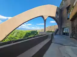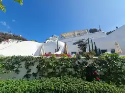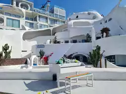The buildings are arranged in cascading layers along the mountainside, primarily in white and light brown. Combined with Mediterranean arches and terraced designs, they create a three-dimensional artistic space resembling a "mountain and sea theater."