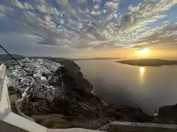 As the sun slowly sets into the Aegean Sea, its golden glow bathes the blue and white rooftops, making the entire Santorini feel as if time has paused.