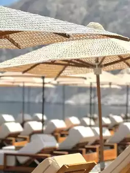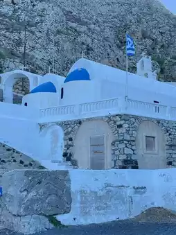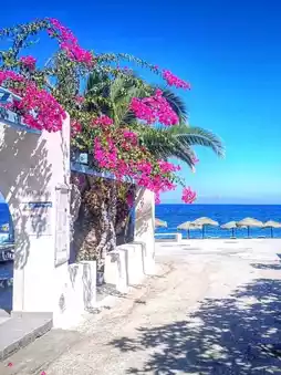 Set against dramatic volcanic cliffs, Kamari Beach dazzles with its black sand, turquoise waters, and lively seaside promenade 🌊✨. Enjoy a swim, sip cocktails at beachfront cafés 🍹, or simply relax under the sun while the Aegean breeze refreshes you 🌴☀️. A perfect mix of beauty and fun!