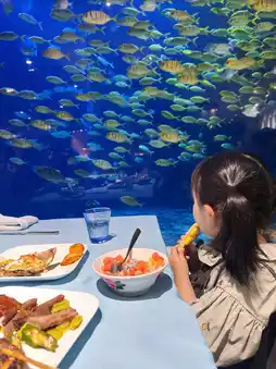 The most impressive part of the hotel is the ocean-themed Hailan Restaurant, the first ocean-themed restaurant in Yalong Bay. You can enjoy delicious food while watching various tropical fish through the huge glass curtain wall, as if you were in the underwater world. There is also a fish-feeding show, which is a surprise for children.