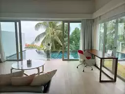 We stayed in a sea-view villa with two bedrooms, a private courtyard, and a heated pool, all for our exclusive use! Outside the pool are beautiful coconut groves and blue sea views, which are spectacular and make for great photos. The room is a double suite with floor-to-ceiling sliding doors and plenty of sunlight. Super cozy.