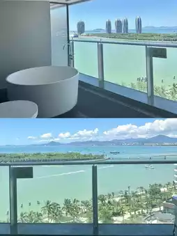 - Every room has floor-to-ceiling windows with a full sea view. I stayed in the **Sky Mirror Seaview Suite**. The living room + two bedrooms all face the sea, and the balcony is super large. During the day, you can see the blue sea and sky. In the evening, you can see the stunning sunset of Sanya Bay. At night, you can enjoy the Phoenix Island light show 🌆! It's so beautiful that you won't want to leave!