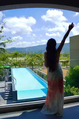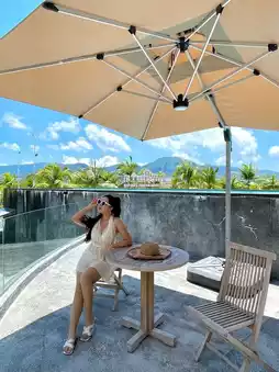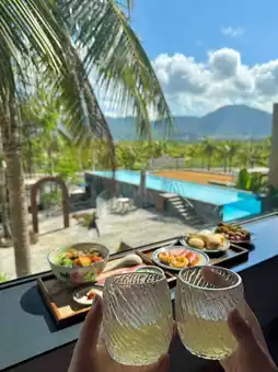 Each room comes with a scenic balcony offering views of coconut trees 🌴, the swimming pool, and the blue sky with fluffy clouds ☁️—pure vibes 🌿! The high-end scented bath amenities make every shower feel like a spa session, and the cloud-like bedding ☁️ ensures you fall asleep instantly and wake up refreshed.