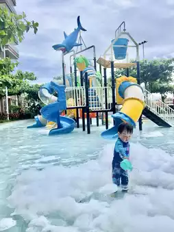 Evening bubble bash at the shallow water park - slides designed so no face splashes, perfect for timid kids~ We also tried the 3rd floor Cloud Pool and infinity pool! The family party was hilarious with energetic staff entertaining kids🤣