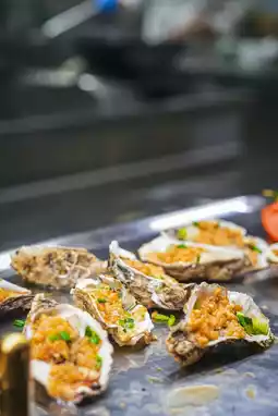The Seabar's terrace overlooks a Ferris wheel, creating a magical atmosphere at night. Their Spanish seafood paella is packed with plump grains, shrimp, and mussels—every bite is pure satisfaction, especially paired with a signature cocktail. Absolute delight!