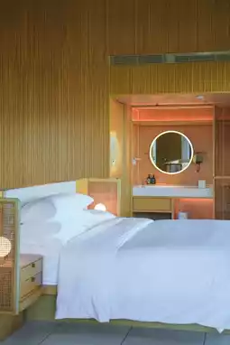 I stayed in the Premium Ocean View Studio Suite, a spacious 90m² with floor-to-ceiling windows on two sides and three viewing balconies—perfect for enjoying the sea from bed. The bathtub by the window offers stunning ocean views while you soak, pure bliss. Teak furniture paired with rattan cabinets gives off strong Southeast Asian vibes, with details that truly stand out!
